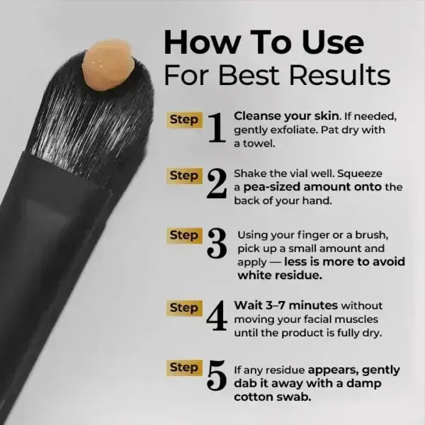 - Using your finger or a brush, pick up a small amount and apply — less is more to avoid white residue.