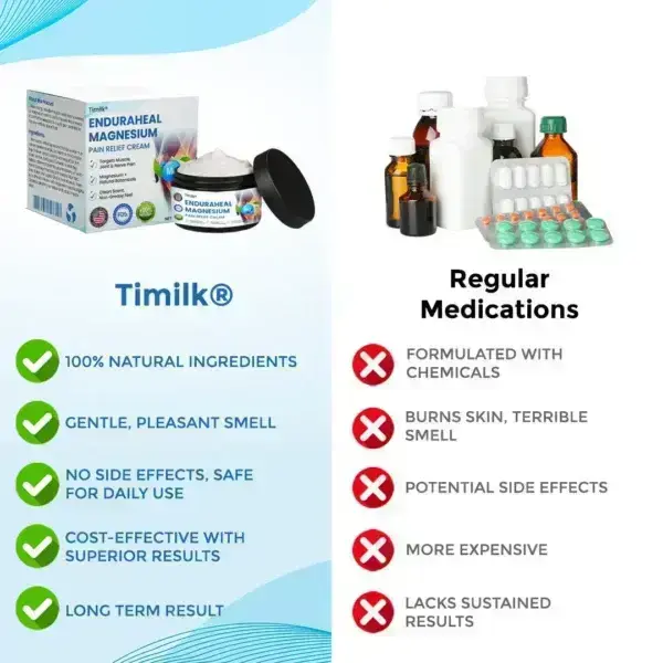 Have you tried pain pills, costly therapies, or quick fixes with little to no relief? You’re not alone. At Timilk®, we believe real comfort comes from smart, natural solutions. The EnduraHeal Magnesium Pain Relief Cream is designed to target discomfort at its source—helping you feel freer, more active, and in control of your life again.